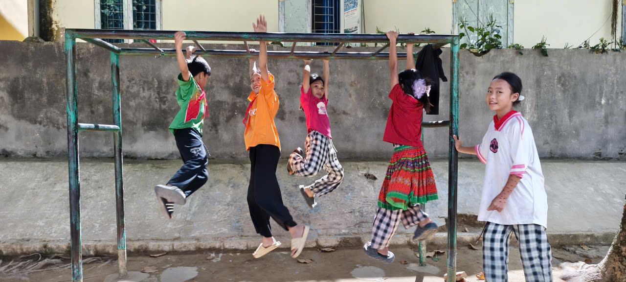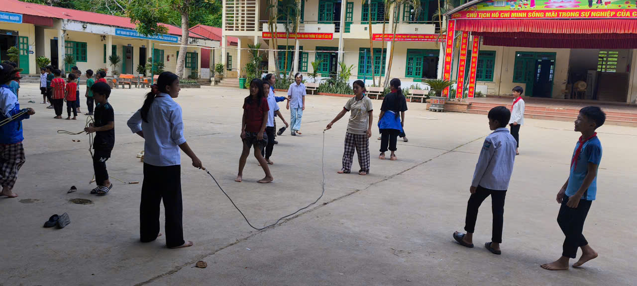 Trên sân trường, những trò chơi quen thuộc như nhảy dây, đá cầu, đu xà, vật tay hay các bài tập thể dục ngoài trời thu hút đông đảo học sinh tham gia. Không phân biệt trai hay gái, lớn hay nhỏ, các em hào hứng hòa mình vào từng nhịp vận động, từng bước chạy, từng tiếng reo vui. Mỗi giọt mồ hôi rơi xuống là một lần cơ thể được rèn luyện, sức khỏe được nâng cao, tinh thần được giải tỏa sau những giờ học căng thẳng. Qua đó, các em học được tinh thần đoàn kết, ý thức kỷ luật, sự tự tin và khả năng phối hợp cùng bạn bè.