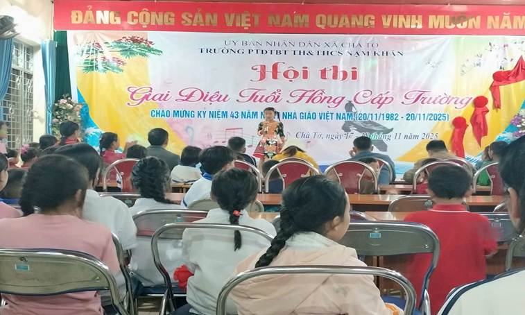 Hướng tới kỷ niệm 43 năm Ngày Nhà giáo Việt Nam (20/11/1982 – 20/11/2025), Trường PTDTBT TH&THCS Nậm Khăn đã trang trọng tổ chức Hội thi “Giai điệu tuổi hồng”, một hoạt động ý nghĩa nhằm tạo sân chơi lành mạnh, khuyến khích học sinh phát triển năng khiếu nghệ thuật. Sân khấu được chuẩn bị chu đáo, rực rỡ sắc màu đã mang đến không khí hân hoan ngay từ những phút biểu diễn đầu tiên.