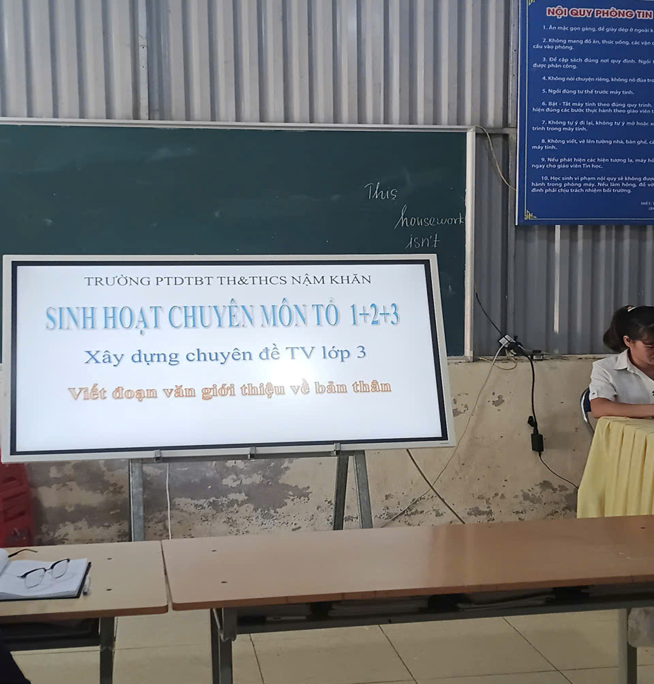 Dưới mái phòng học đơn sơ nhưng ấm áp của Trường PTDTBT TH&THCS Nậm Khăn, buổi sinh hoạt chuyên môn tổ 1+2+3 đã diễn ra trong không khí nghiêm túc, cởi mở và đầy nhiệt huyết. Đây là dịp để các thầy cô cùng nhau trao đổi, học hỏi và nâng cao chuyên môn với chuyên đề “Xây dựng chuyên đề Tiếng Việt lớp 3 – Viết đoạn văn giới thiệu về bản thân”. Buổi sinh hoạt trở nên đặc biệt hơn khi 100% học sinh của nhà trường là người dân tộc thiểu số, vì thế mọi hoạt động dạy học đều cần được điều chỉnh phù hợp, gần gũi và dễ hiểu, giúp các em từng bước tự tin sử dụng tiếng Việt để bày tỏ cảm xúc và suy nghĩ của mình.
