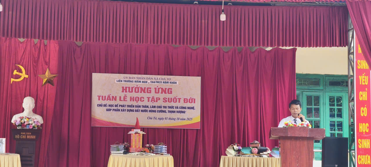 Sáng ngày 01 tháng 10 năm 2025, tại Liên trường Mầm non, Tiểu học & THCS Nậm Khẩn (xã Chà Tở), Lễ hưởng ứng Tuần lễ Học tập suốt đời đã được tổ chức trong không khí trang trọng và ấm áp. Buổi lễ có sự tham dự của các đồng chí lãnh đạo Ủy ban nhân dân xã Chà Tở, cùng đông đảo thầy cô giáo, học sinh và phụ huynh.